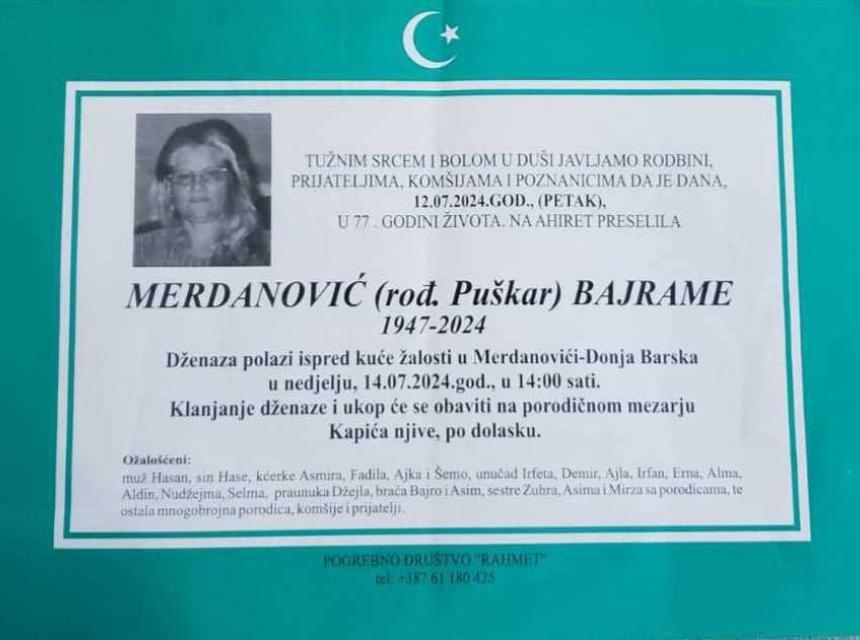 Tužnim srcem i bolom u duši javljamo rodbini, prijateljima i komšijama da je naša draga Merdanović (rođ. Puškar) Bajrame, dana 12.07.2024. godine u 77-oj godini života, preselila na Ahiret.