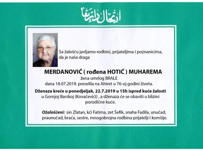 Sa žalošću javljamo rodbini, prijateljima i poznanicima, da je naša draga Merdanović (rođena Hotić) Muharema žena umrlog Brale dana 18.07.2019. preselila na Ahiret u 76-oj godini života.