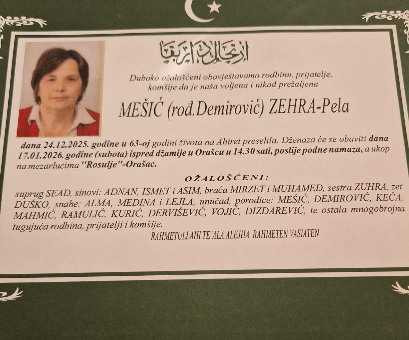 Duboko ožalošćeni obavještavamo rodbinu, prijatelje i komšije da je naša voljena i nikad prežaljena MEŠIĆ (rođ. Demirović) ZEHRA – Pela dana 24.12.2025. godine, u 63-oj godini života, na Ahiret preselila.