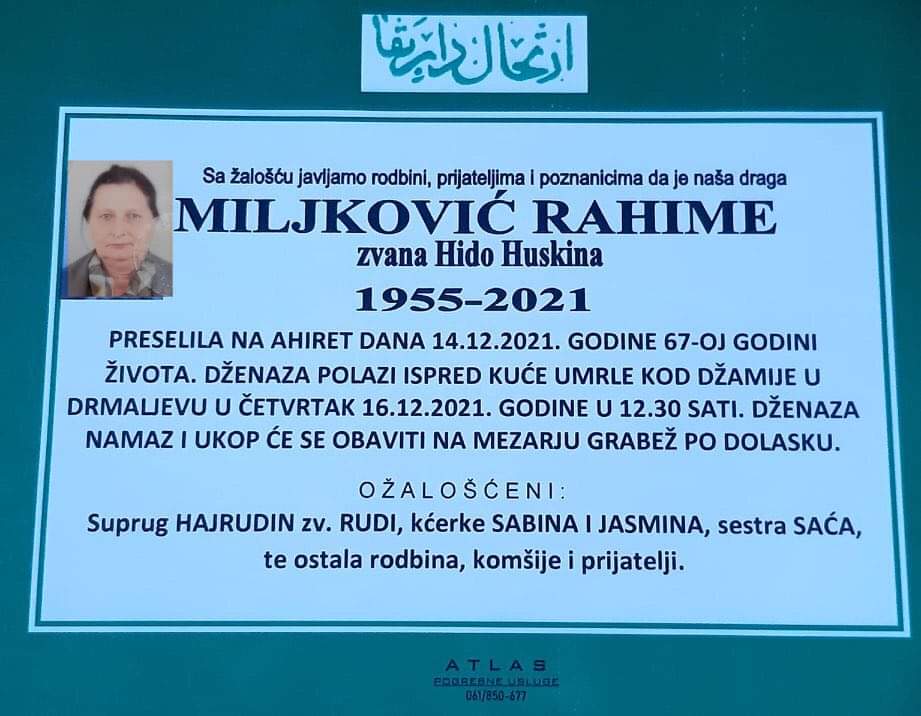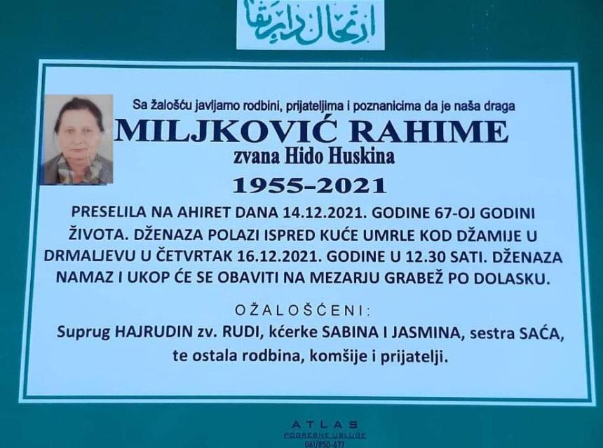Tužnog srca i s bolom u duši obavještavamo rodbinu, komšije i prijatelje da je naša draga Miljković Rahime dana 14.12.2021. u 67. godini života preselila na ahiret.