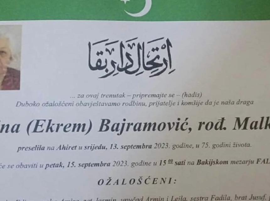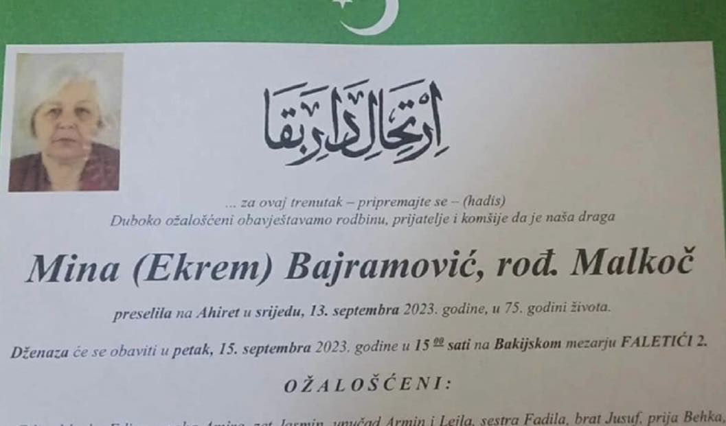 Duboko ožalošćeni obavještavamo rodbinu, prijatelje i komšije da je naša draga Mina (Ekrem) Bajramović rod. Malkoč preselila na Ahiret u srijedu, 13. septembra 2023. godine, u 75. godini života