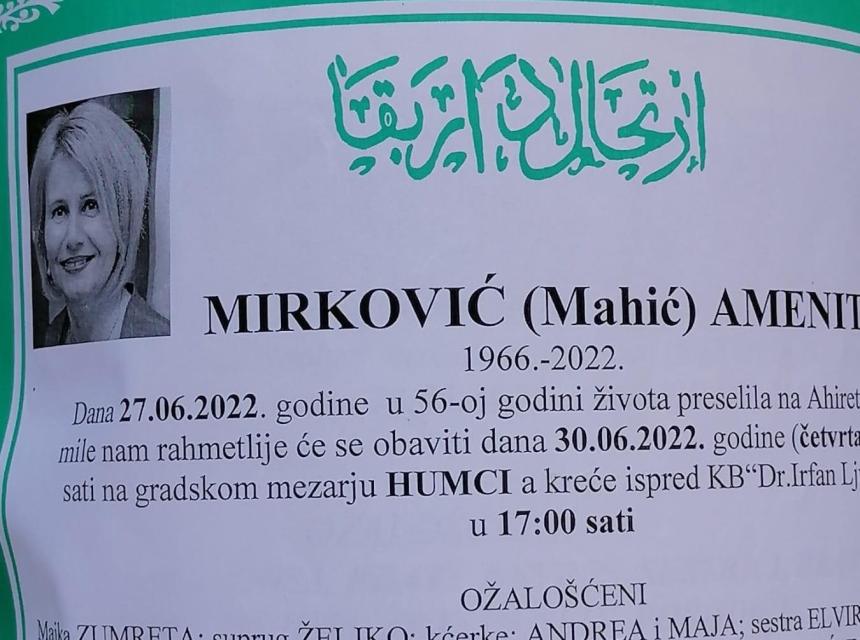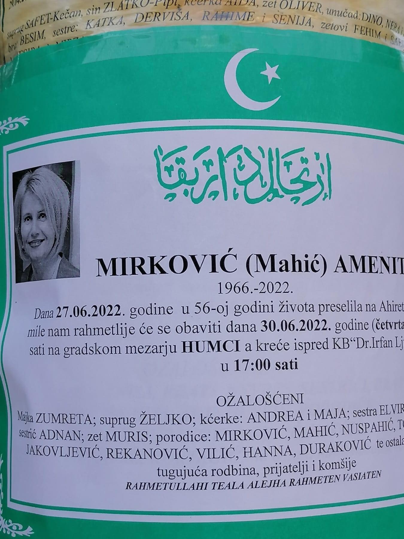 Tužnim srcem i bolom u duši javljamo rodbini, prijateljima i komšijama da je dana 27.06.2022.godine, u 56. godini života na Ahiret preselila Mirković (Mahić) Amenita .
