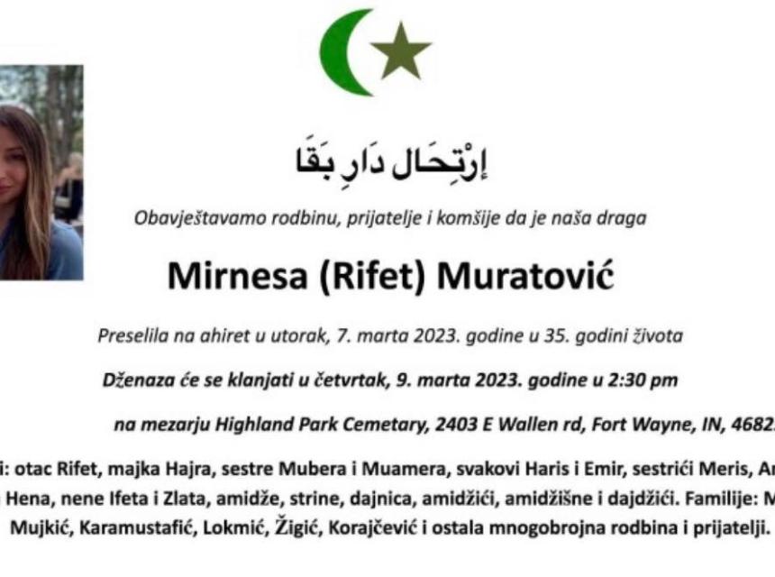 Tužnim srcem i s bolom u duši javljamo rodbini, prijateljima i komšijama da je naša draga Mirnesa (Rifet) Muratović, dana 07.03.2023. godine u 35-oj godini života, preselila na Ahiret.