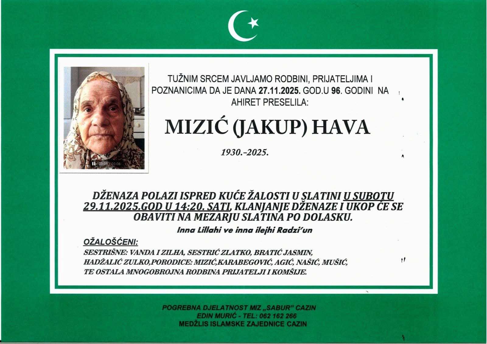 TUŽNIM SRCEM JAVLJAMO RODBINI, PRIJATELJIMA I POZNANICIMA DA JE DANA 27.11.2025. GOD. U 96. GODINI NA AHIRET PRESELILA MIZIĆ (JAKUP) HAVA.