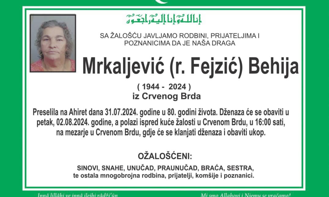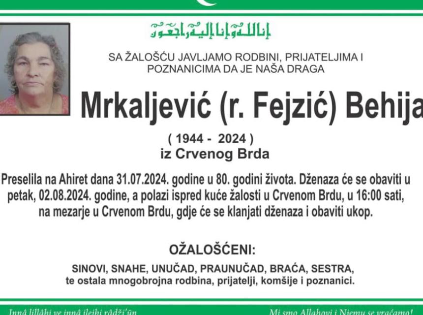 Tužnim srcem i bolom u duši javljamo rodbini, prijateljima i komšijama da je naša draga Mrkaljević (r. Fejzić) Behija, dana 31.07.2024. godine u 80-oj godini života, preselila na Ahiret.