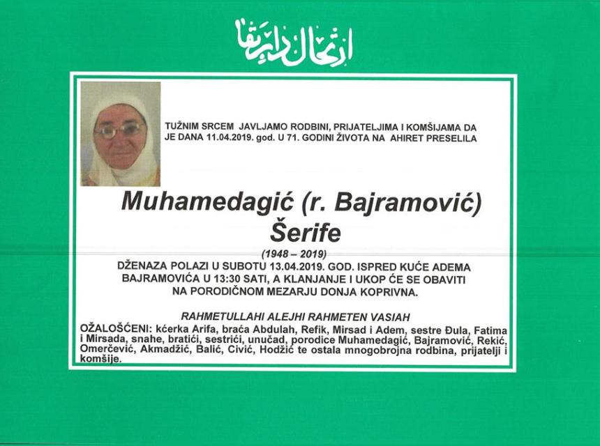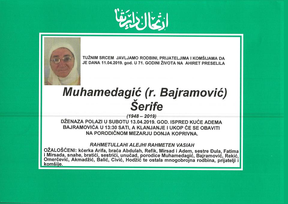 Tužnim srcem i bolom u duši javljamo rodbini, prijateljima i komšijama da je dana 11.04.2019. godine u 71-oj godini života na Ahiret preselila Muhamedagić (rođ. Bajramović) Šerife.
