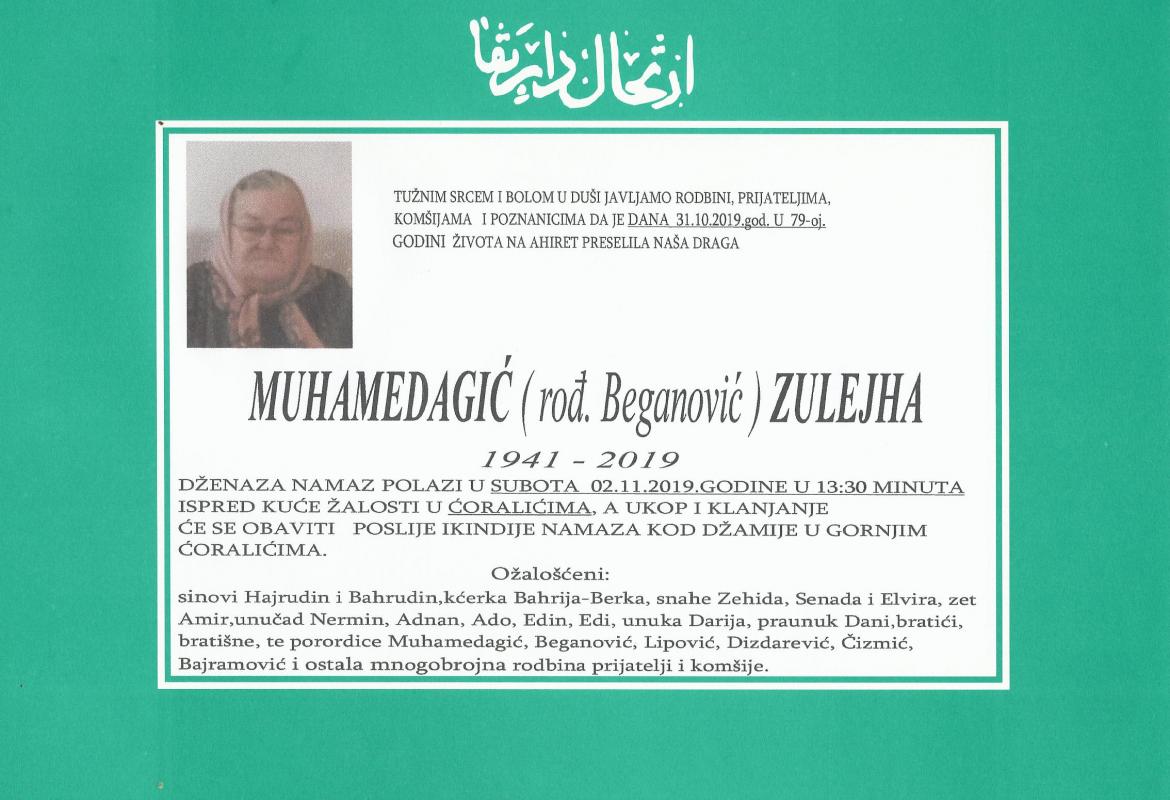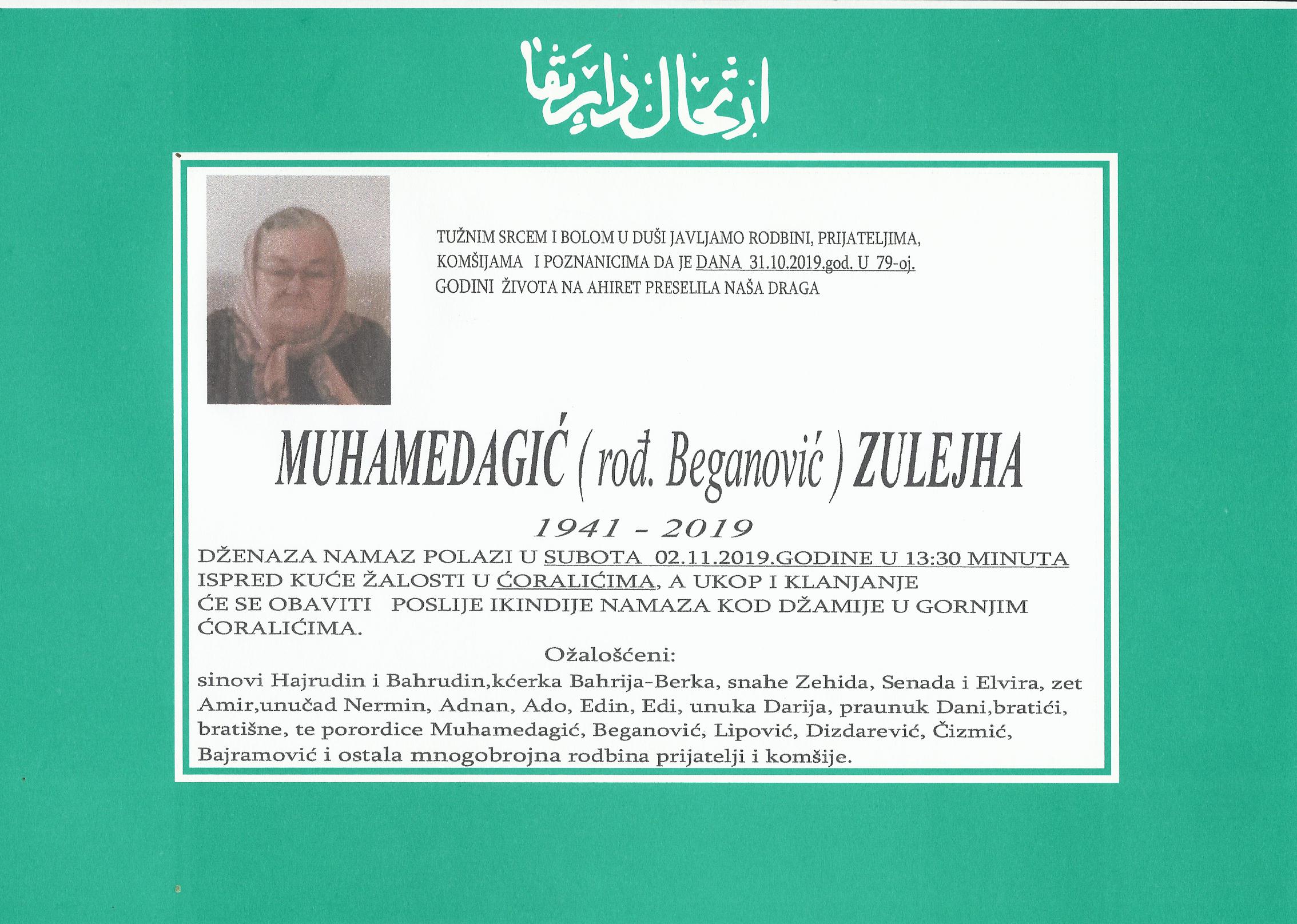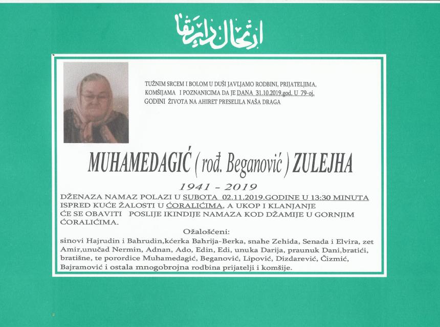 Sa žalošću, bolom i tugom javljamo rodbini, prijateljima i poznanicima da je naša draga Muhamedagić (rođ. Beganović) Zulejha, 31.10.2019.g. preselila na Ahiret u 79. g. života.