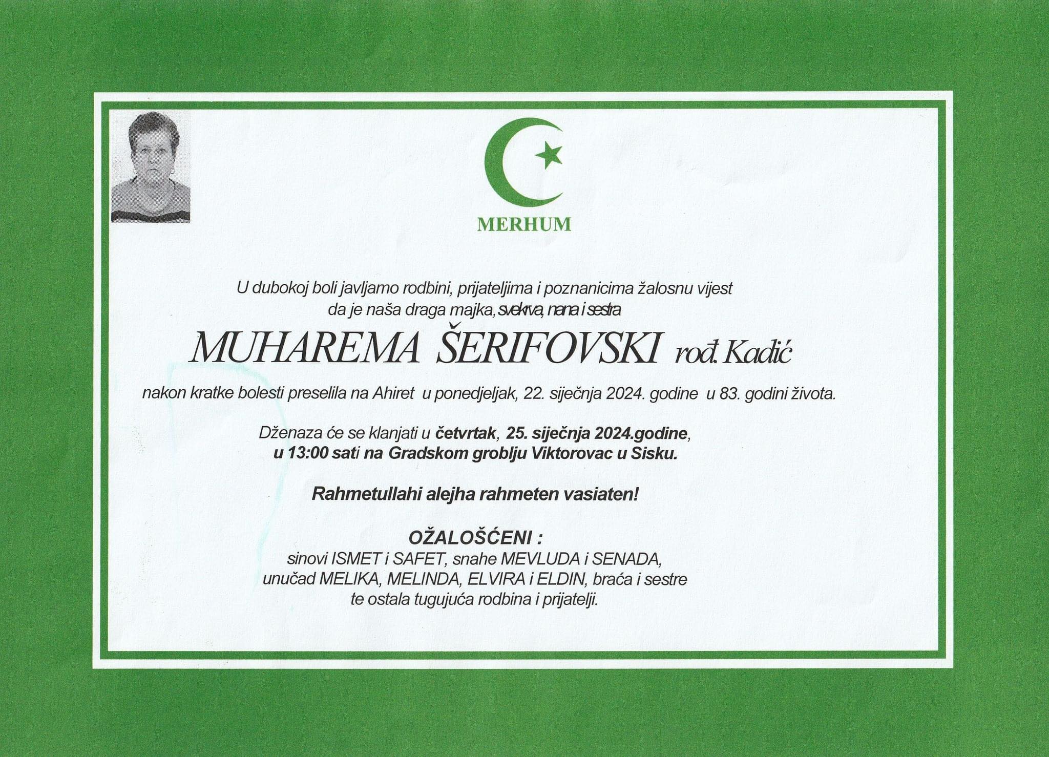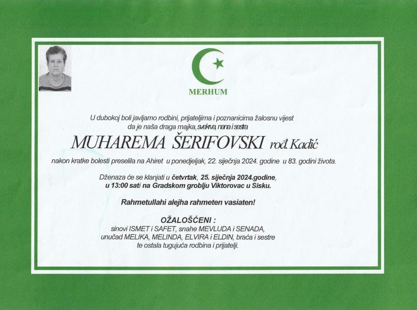 Tužnim srcem javljamo rodbini, prijateljima i komšijama da je u 22.01.2024. god u 83. godini života na Ahiret preselila Muharema Šerifovski rođ. Kadić.