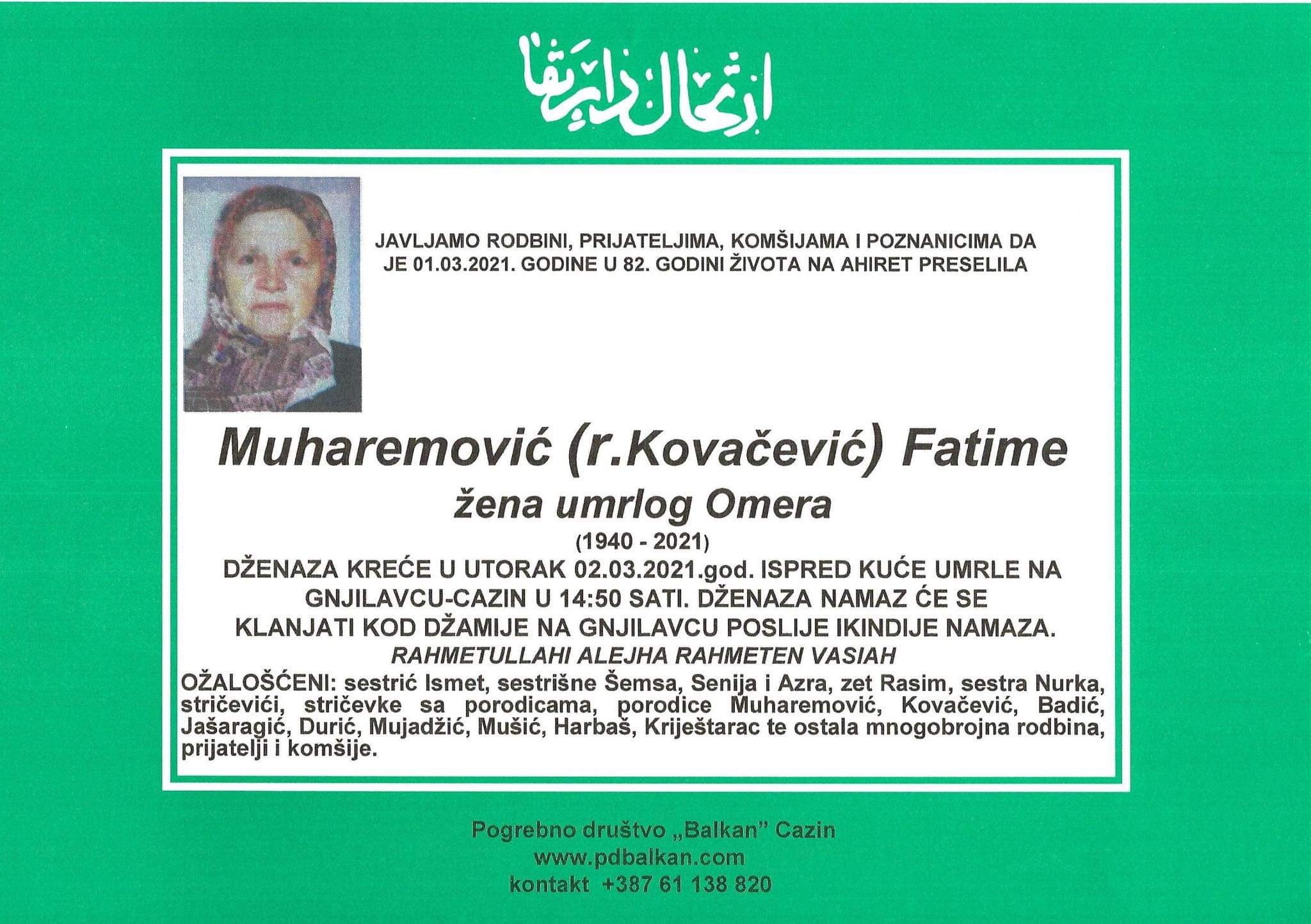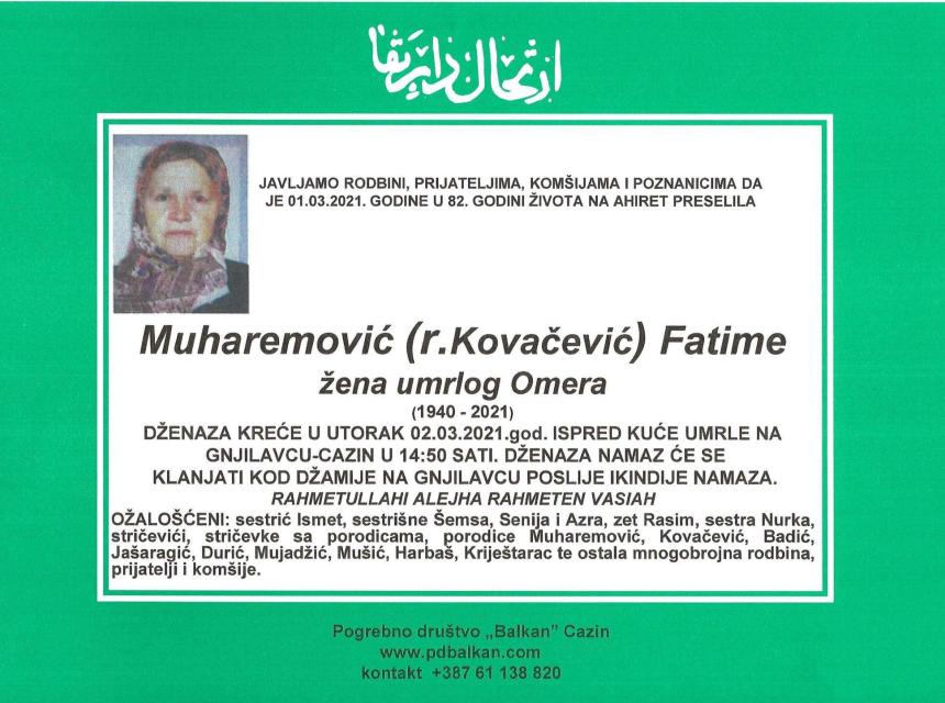 Tužnog srca i s bolom u duši obavještavamo rodbinu, komšije i prijatelje da je naša draga Muharemović (r. Kovačević) Fatime, dana 01.03.2021. godine, u 82-oj godini života, preselila na Ahiret.