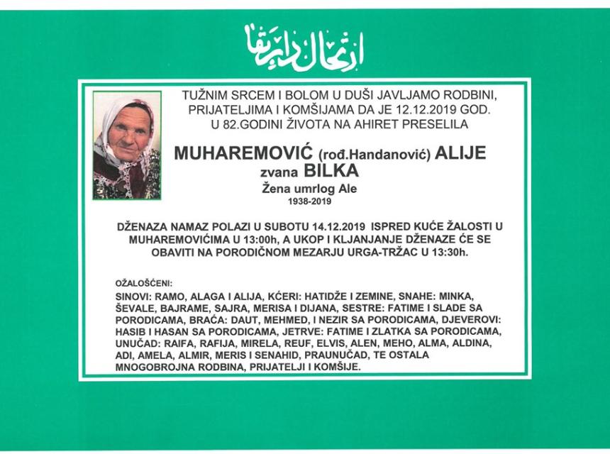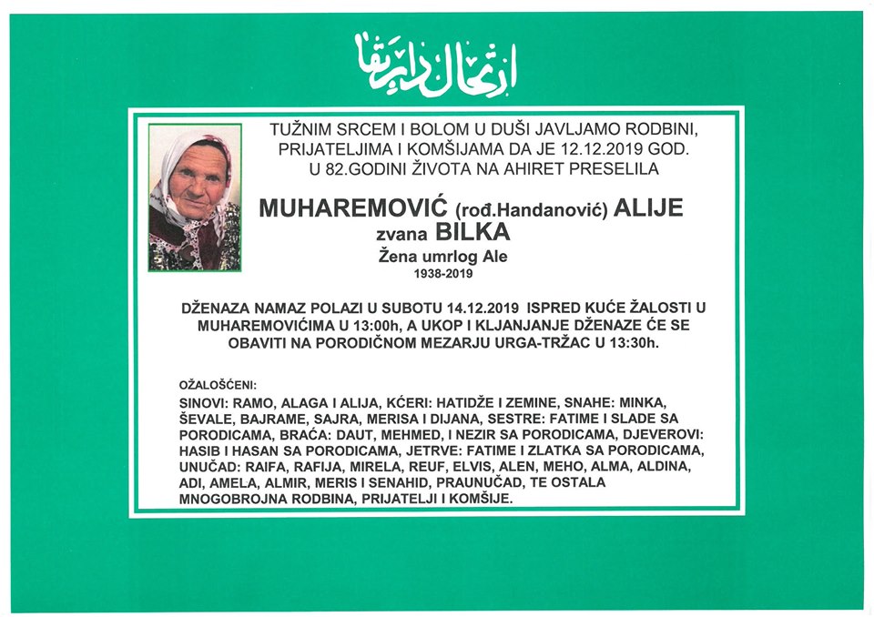 Tužnim srcem i bolom u duši javljamo rodbini, prijateljima i komšijama da je 12.12.2019 god. u 82. godini života na Ahiret preselila Muharemović (rođ.Handanović) Alije zvana Bilka, žena umrlog Ale. Dženaza namaz polazi u subotu 14.12.2019. ispred kuće žalosti u Muharemovićima u 13.00h, a ukop i klanjanje dženaze će se obaviti na porodičnom mezarju Urga-Tržac u 13:30h.