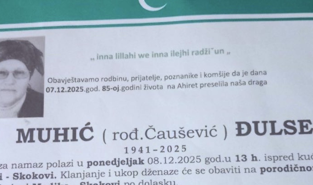Dženaza-namaz polazi u ponedjeljak, 08.12.2025. godine, u 13:00 sati ispred KUD-a i Skokovi. Klanjanje i ukop dženaze obavit će se na porodičnom mezarju kod Medika – Skokovi po dolasku.