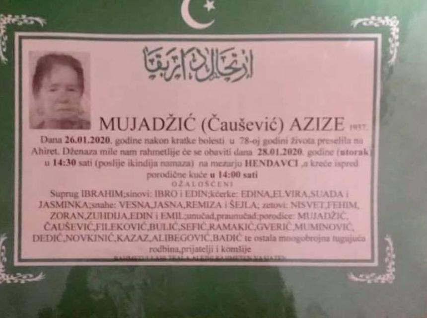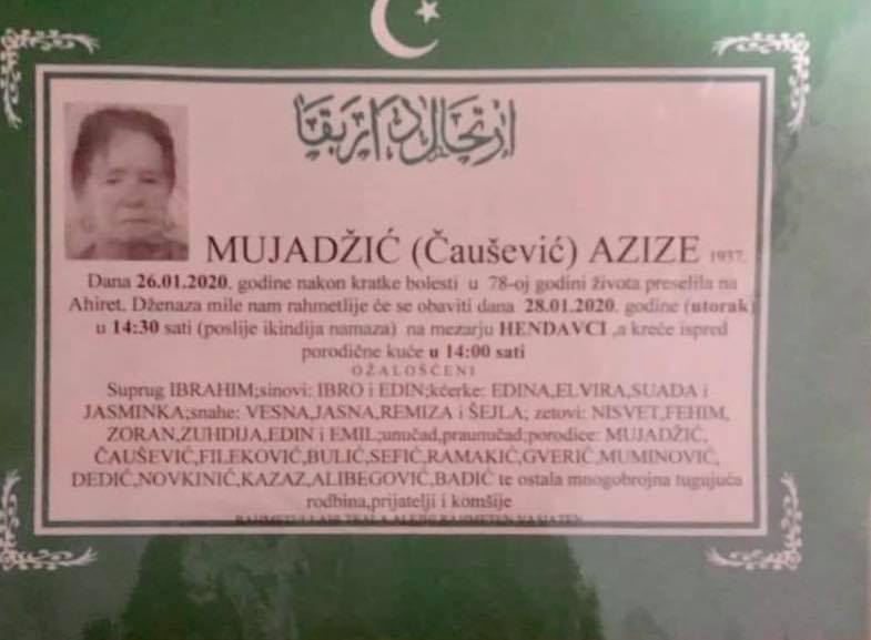 Tužnim srcem i bolom u duši obaviještavamo rodbinu, komšije i prijatelje da je naša draga Mujadžić (Čaušević) Azize dana 26.01.2020. godine preselila na Ahiret.