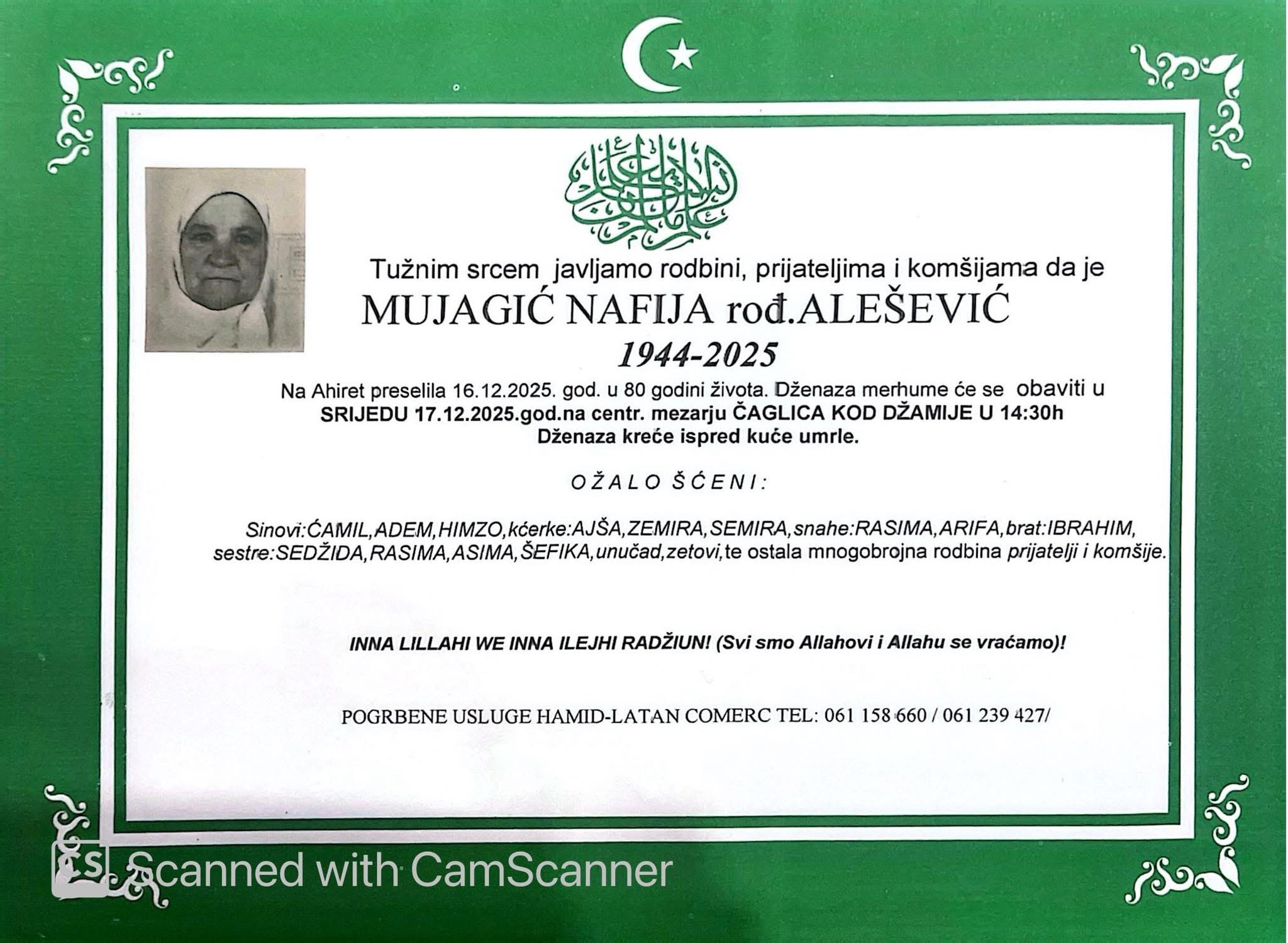 Dženaza merhume će se obaviti u srijedu 17.12.2025. godine, na centralnom mezarju Čaglica kod džamije u 14:30 sati.