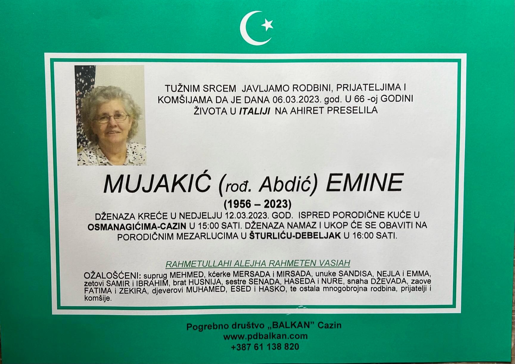 Tužnim srcem i bolom u duši javljamo rodbini, prijateljima i komšijama da je naša draga Mujakić (rođ. Abdić) Emine, dana 06.03.2023. godine u 66-oj godini života u Italiji, preselila na Ahiret.