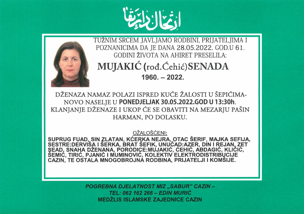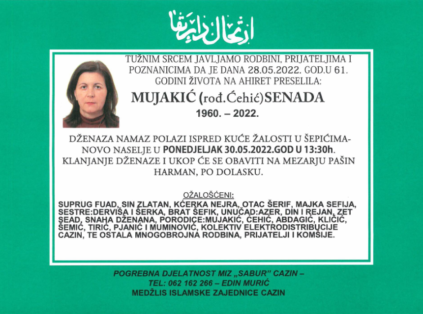 Tužnog srca i s bolom u duši obavještavamo rodbinu, komšije i prijatelje da je naša draga Mujakić (rođ. Ćehić) Senada u 61. godini života preselila na Ahiret.