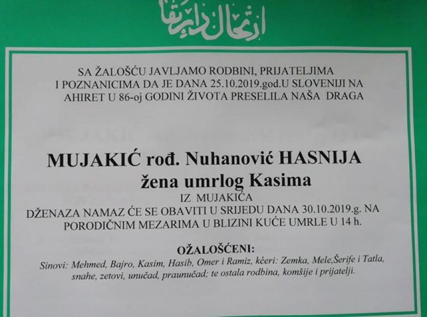 Sa žalošću javljamo rodbini, prijateljima i poznanicima da je dana 25.10.2019.god. u Sloveniji na Ahiret u 86-oj godini života preselila naša draga Mujakić rođ. Nuhanović Hasnija.