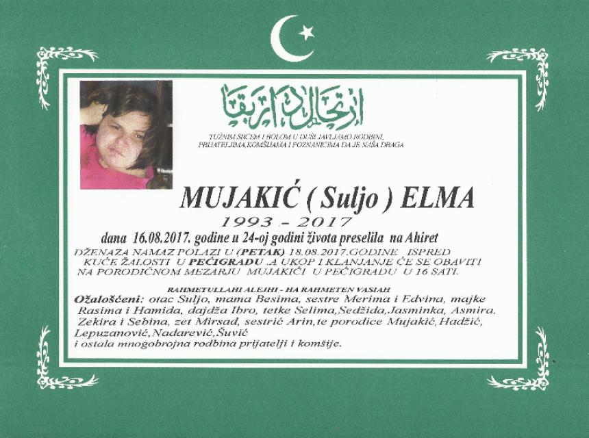 Tužnim srcem i bolom u duši javljamo rodbini, prijateljima, komšijama i poznanicima da je dana 16.08.2017. godine u 24-oj godini života na Ahiret preselila Mujakić (Suljo) Elma.