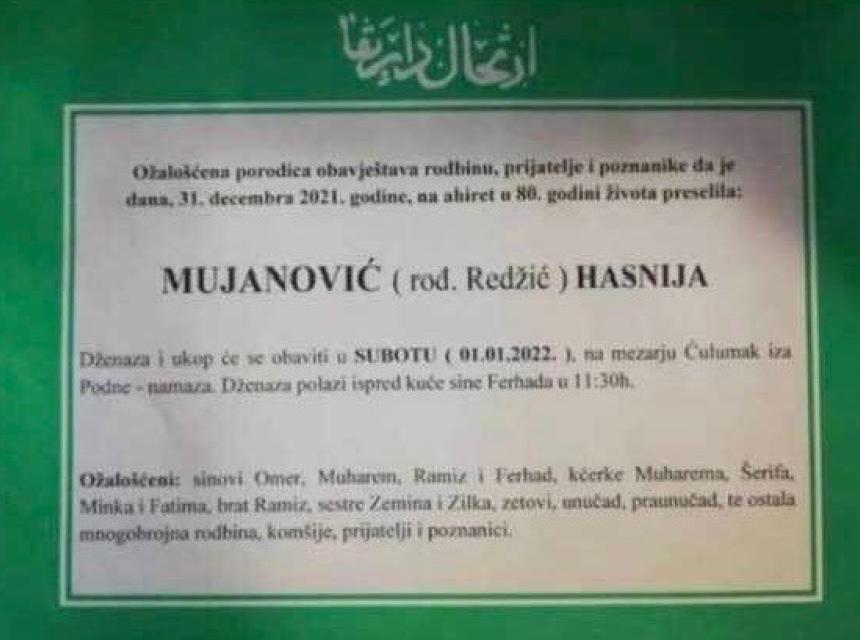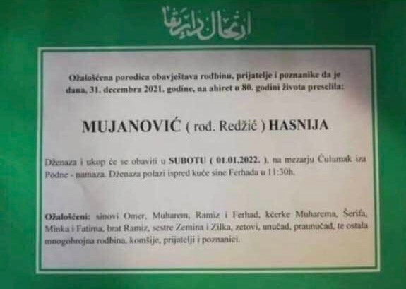 Tužnog srca i s bolom u duši obavještavamo rodbinu, komšije i prijatelje da je naša draga Mujanović (rođ. Redžić) Hasnija dana 31.12.2021. godine na Ahiret preselila u 80-oj godini života.