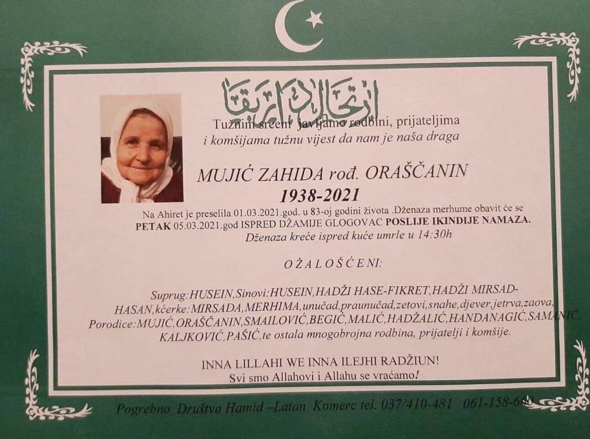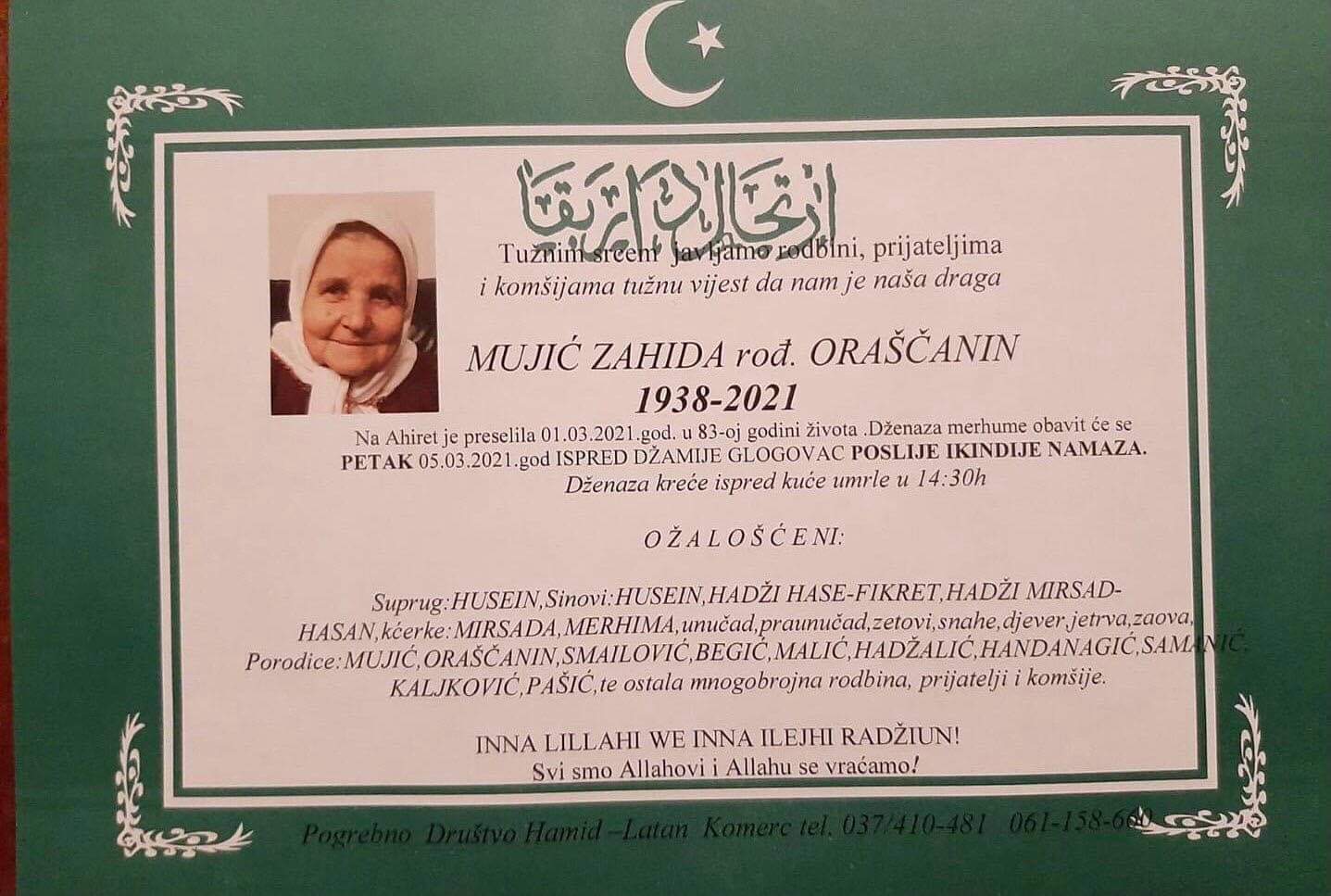 Tužnog srca i s bolom u duši obavještavamo rodbinu, komšije i prijatelje da je naša draga Mujić Zahida rođ. Oraščanin, dana 01.03.2021. godine, u 83-oj. godini života, preselila na Ahiret.