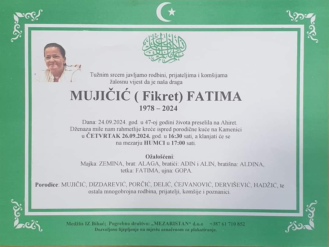 Tužnim srcem i bolom u duši javljamo rodbini, prijateljima i komšijama da je naša draga Mujičić (Fikret) Fatima dana 24.09.2024 god. u 47-oj godini života.