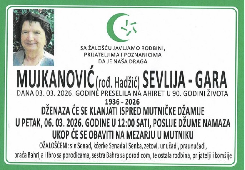 Dženaza će se klanjati ispred Mutničke džamije u petak, 06.03.2026. godine u 12:00 sati, poslije džume-namaza.