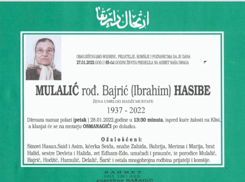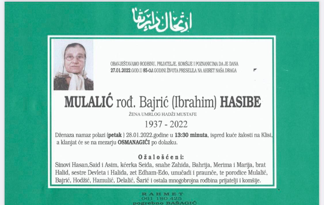 Tužnog srca i s bolom u duši obavještavamo rodbinu, komšije i prijatelje da je naša draga Mulalić rođ. Bajrić (Ibrahim) Hasibe, dana 27.01.2022. godine, u 85-oj godini života, preselila na Ahiret.