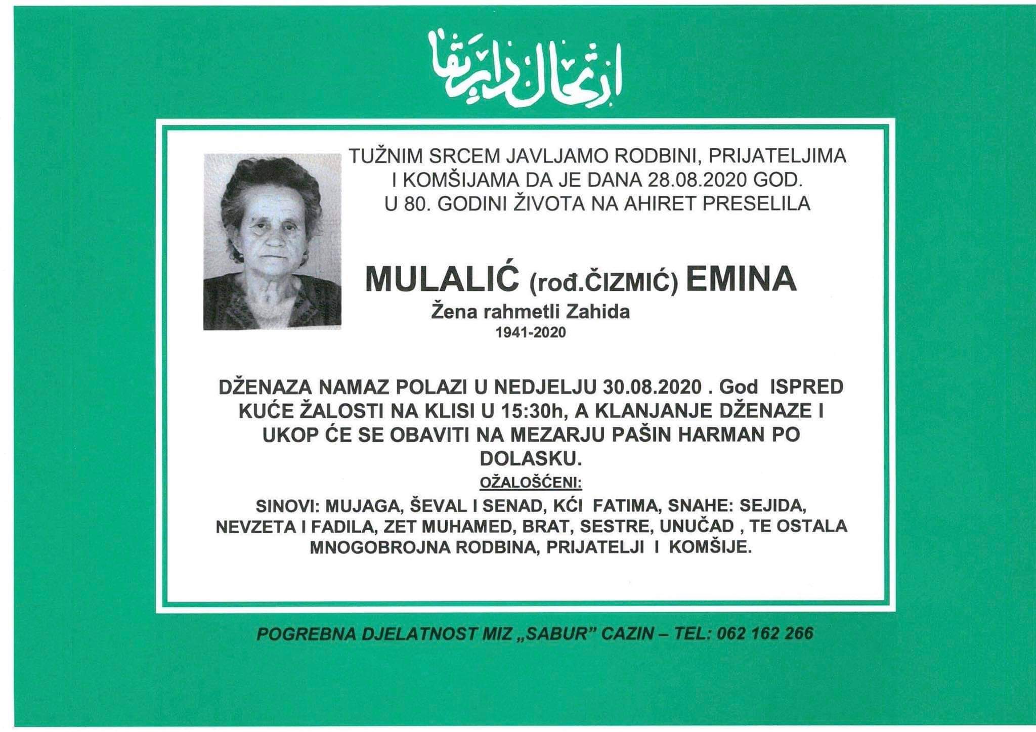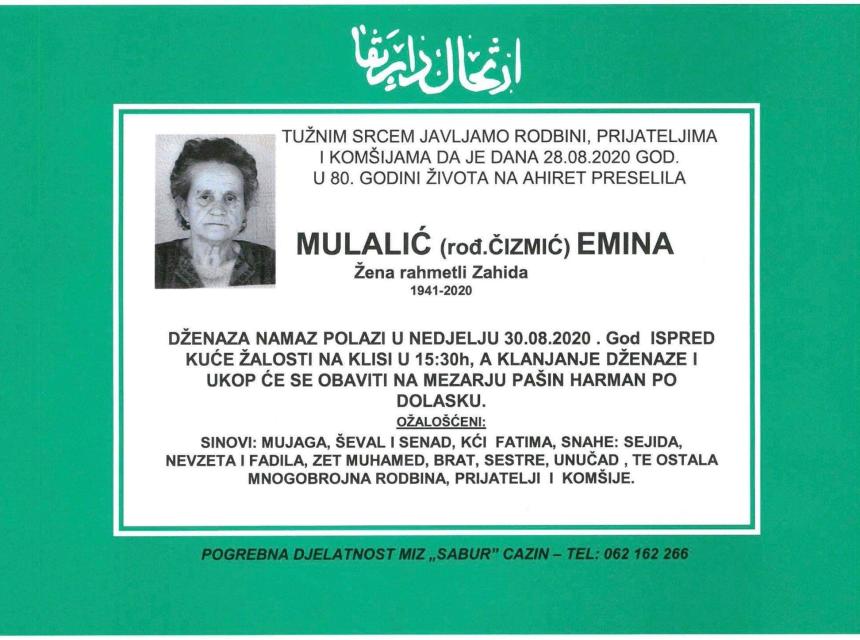 Tužnog srca i s bolom u duši obavještavamo rodbinu, komšije i prijatelje da je naša draga Mulalić (rođ. Čizmić) Emina , dana 28.08.2020. godine, u 80-oj. godini života, preselila na Ahiret.