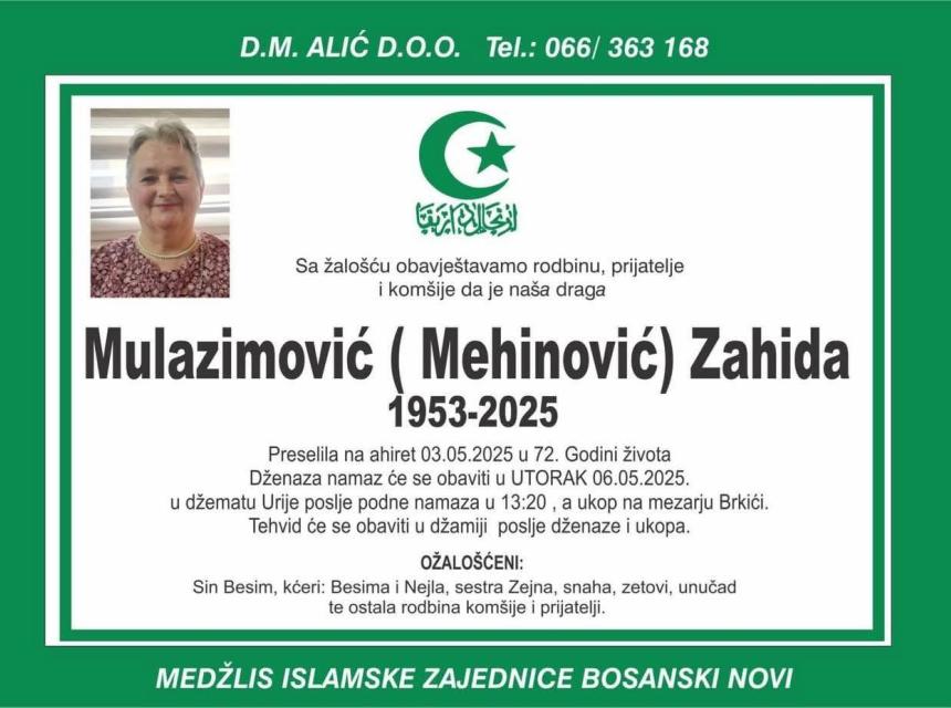 Tužnim srcem javljamo rodbini, prijateljima i poznanicima žalosnu vijest, da nam je naša draga MULAZIMOVIĆ (Mehinović) ZAHIDA dana 03.05.2025. godine u 72-oj godini života na ahiret preselila.