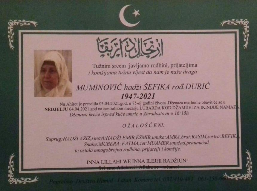 Tužnog srca i s bolom u duši obavještavamo rodbinu, komšije i prijatelje da je naša draga Muminović hadži Šefika rođ Durić, dana 03.04.2021 godine, u 75-oj godini života, preselila na Ahiret.