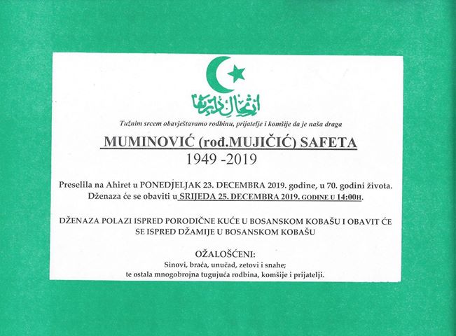 Tužnim srcem i s bolom u duši javljamo rodbini, prijateljima i komšijama da je 23.12.2019. god u 70. godini života na Ahiret preselila Muminović (Mujičić) Safeta.