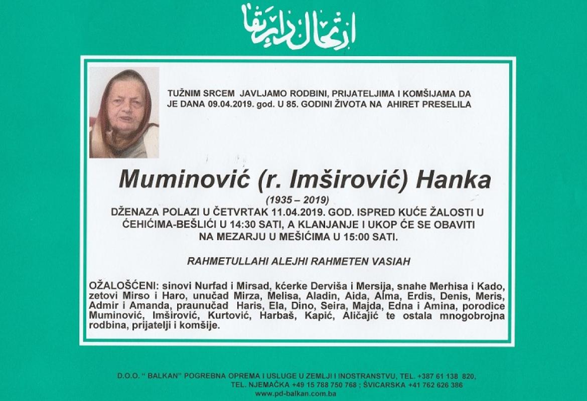 Tužnim srcem i bolom u duši javljamo rodbini, prijateljima i komšijama da je dana 09.04.2019. godine u 85-oj godini života na Ahiret preselila Muminović (rođ. Imširović) Hanka.