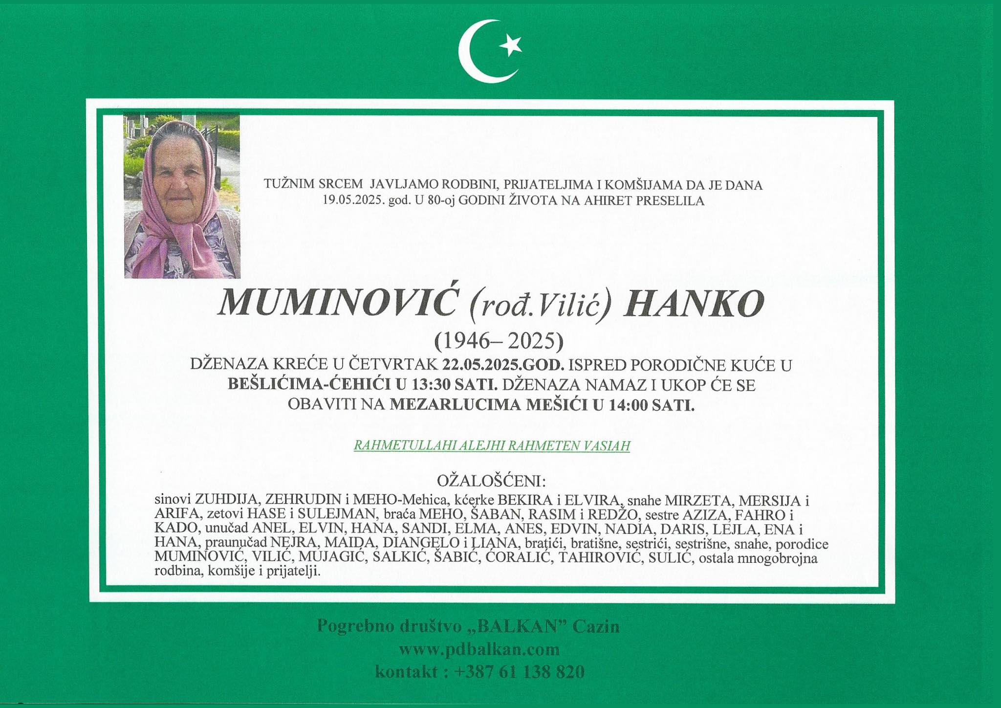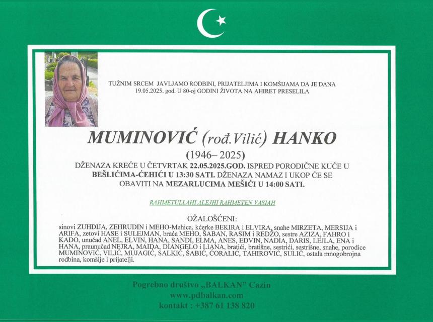 TUŽNIM SRCEM JAVLJAMO RODBINI, PRIJATELJIMA I KOMŠIJAMA DA JE DANA 19.05.2025. GOD. U 80-oj GODINI ŽIVOTA NA AHIRET PRESELILA MUMINOVIĆ (rođ. Vilić) HANKO (1946 – 2025)