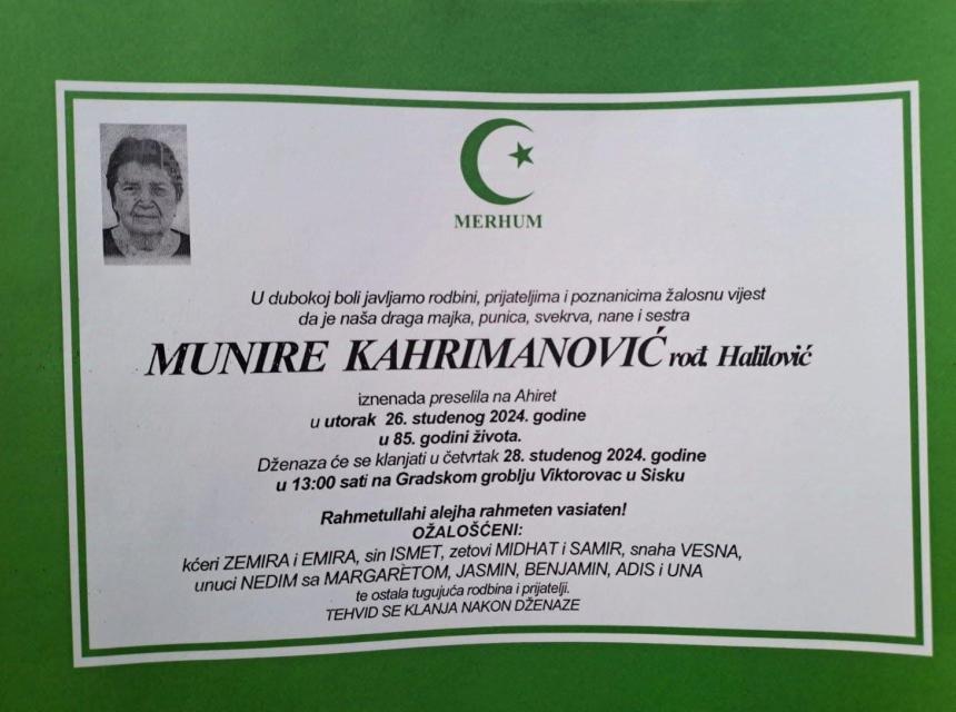 S velikom tugom u srcu obavještavamo vas da je na Bolji svijet preselila rahmetlni Munire Kahrimanović rođ. Halilović.