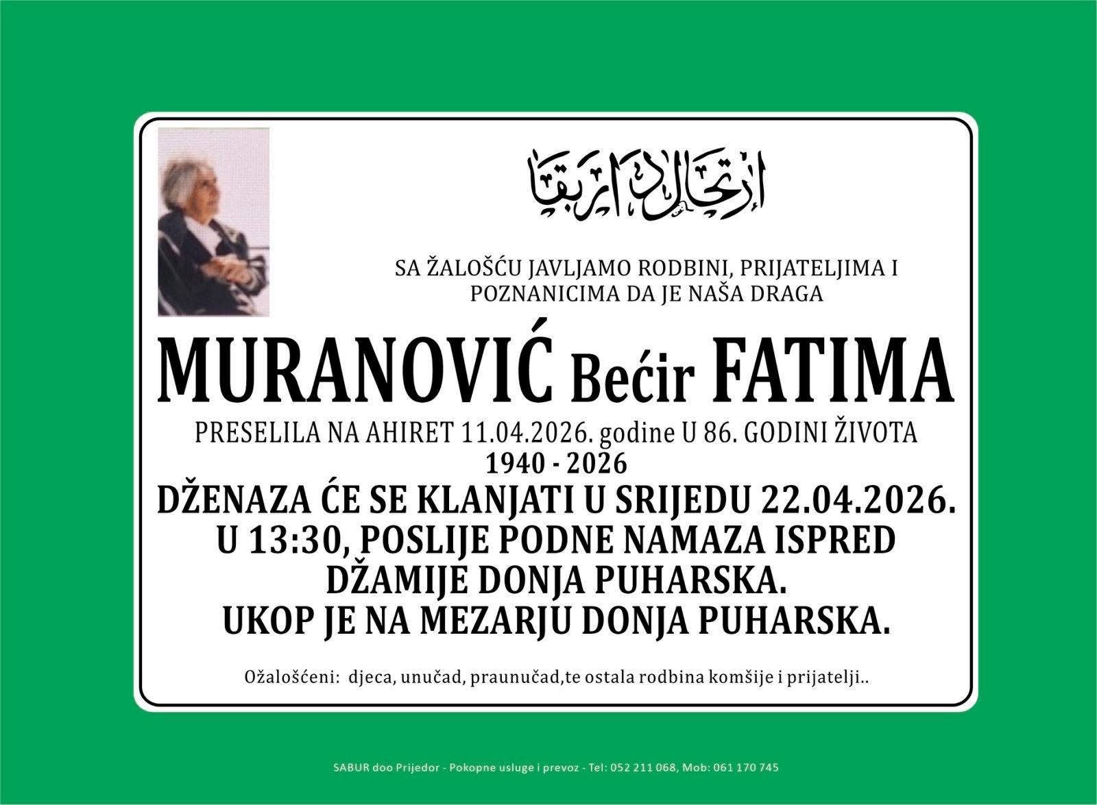 Dženaza će se klanjati u srijedu 22.04.2026. godine u 13:30, poslije podne namaza, ispred džamije Donja Puharska.