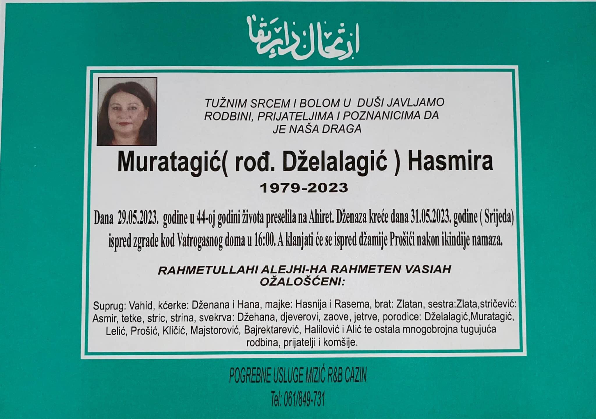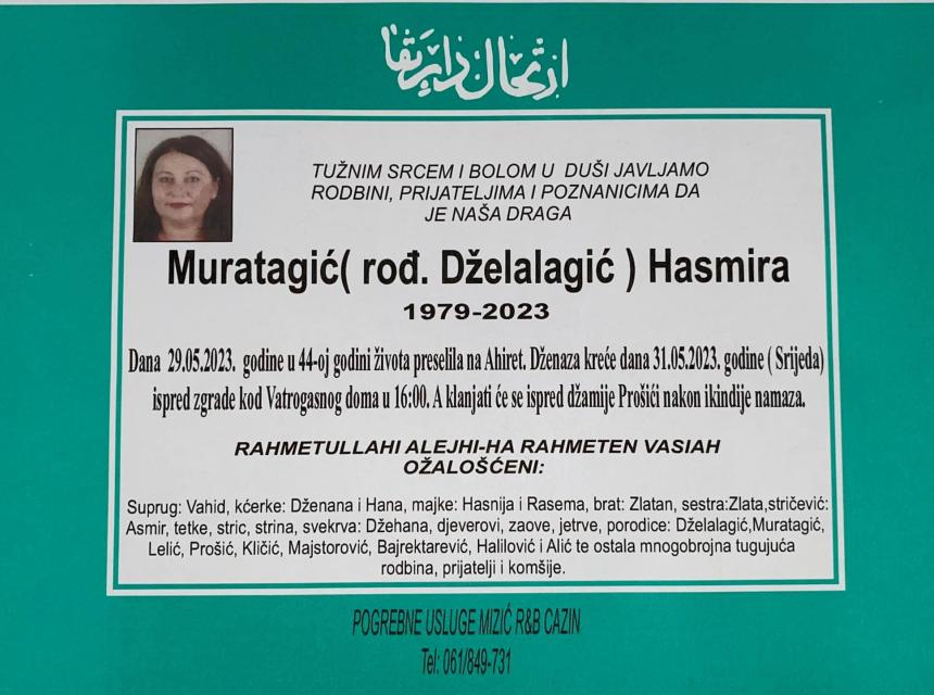 Tužnim srcem i bolom u duši javljamo rodbini, prijateljima i komšijama da je naša draga Muratagić (rođ. Dželalagić) HAsmira , dana 29.05.2023. godine u 44-oj godini života, preselila na Ahiret.