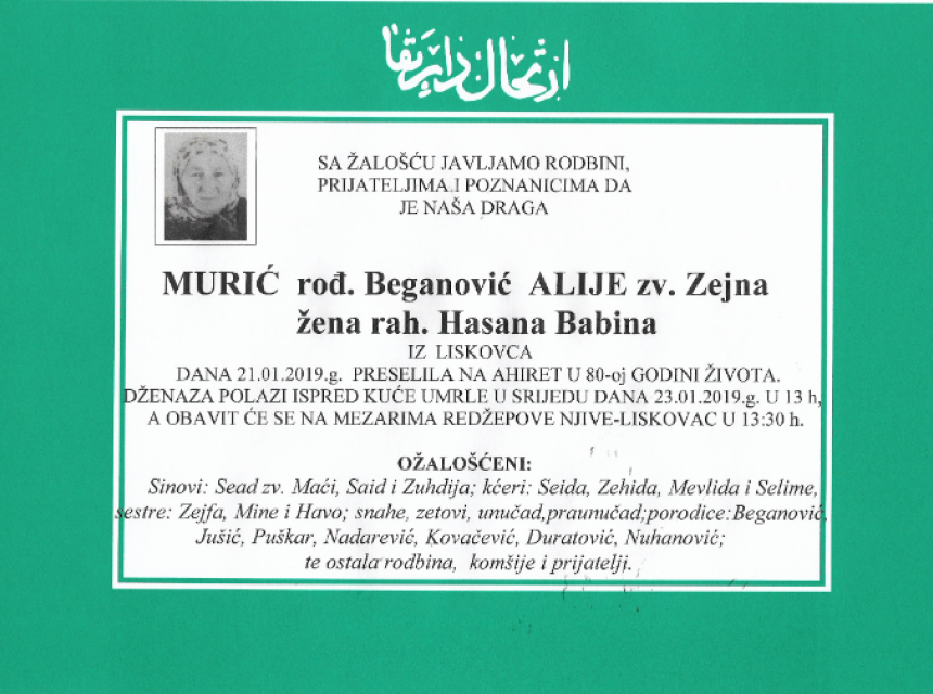 Dana 21.01. 2019 u 80. godini života na Ahiret preselila Murić (rođeno Beganović) Alije, zvana Zejna, žena rahmetli Hasana Babina iz Liskovca. Dženaza namaz polazi ispred kuće umrle u srijedu dana 23.01.2019. u 13 sati, a obavit će se na mezarima Redžepove Njive-Liskovac u 13:30 h.