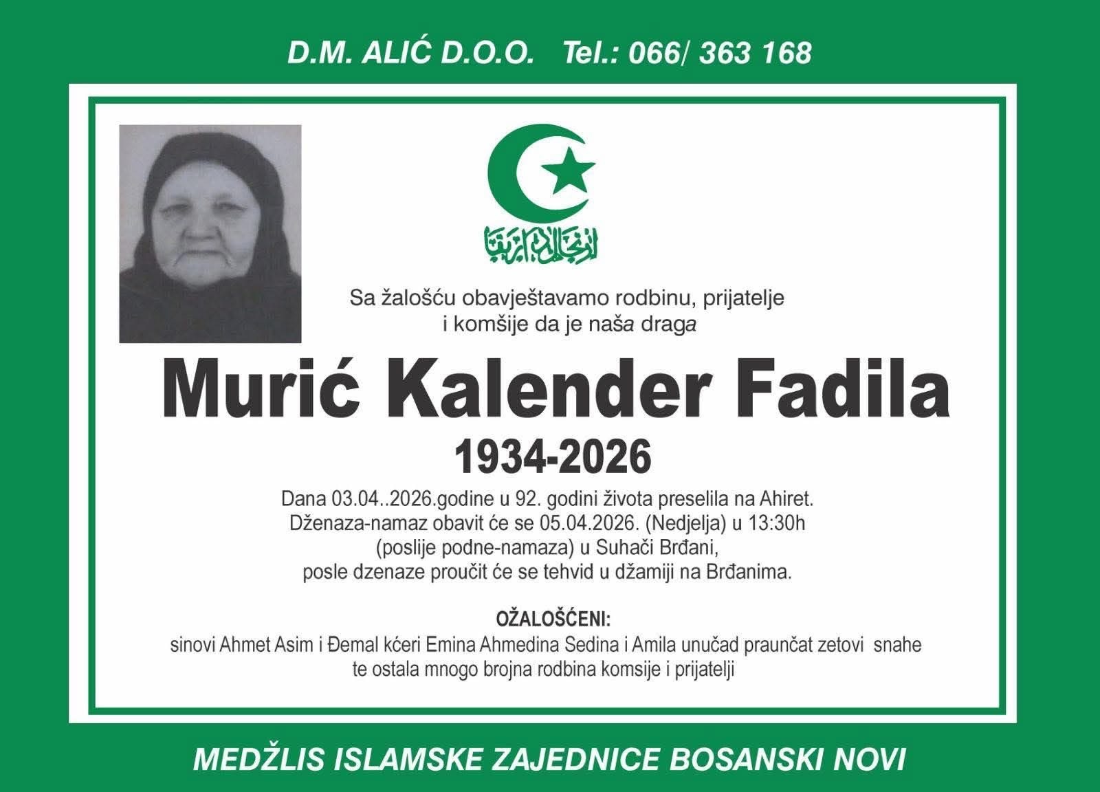 Dženaza-namaz obavit će se 05.04.2026. (nedjelja) u 13:30 h (poslije podne-namaza) u Suhači Brdani, poslije dženaze proučit će se tevhid u džamiji na Brdanima.