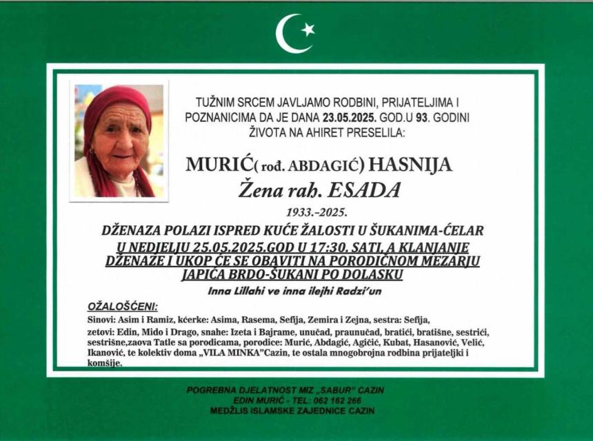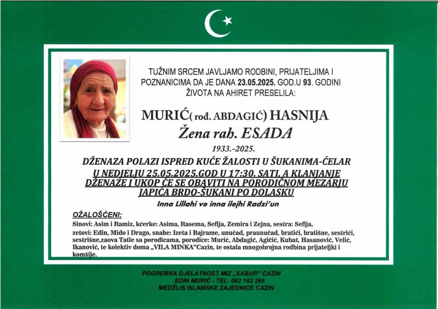 Tužnim srcem i bolom u duši javljamo rodbini, prijateljima i komšijama da je naša draga Murić (rođ. Abdagić) Hasnija žena rah. Esada, dana 23.05.2025. godine u 93-oj godini života, preselila na Ahiret.