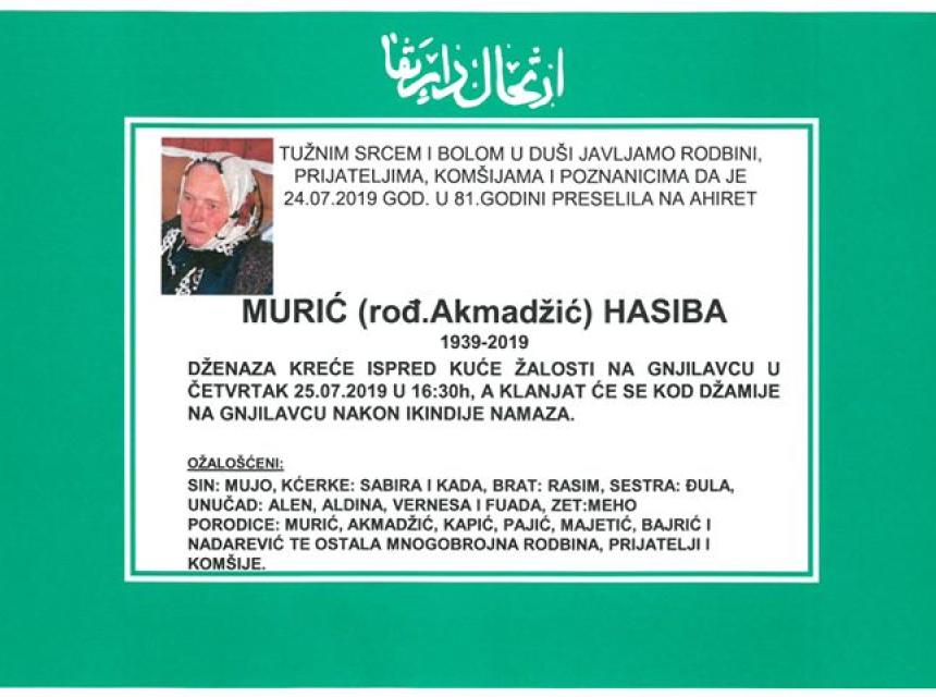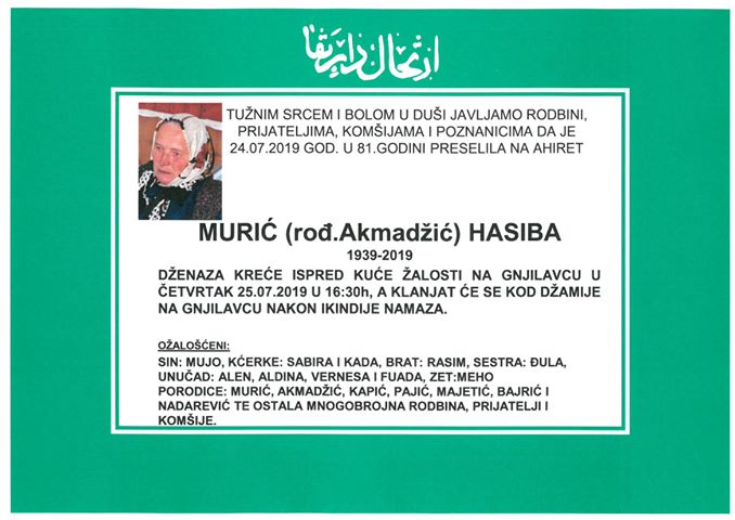 Tužnim srcem i bolim u duši javljamo rodbni, prijateljima, komšijama i poznanicima da je dana 24.07.2019. godine u 81-oj godini života na Ahiret preselila Murić (rođ. Akmadžić) Hasiba .