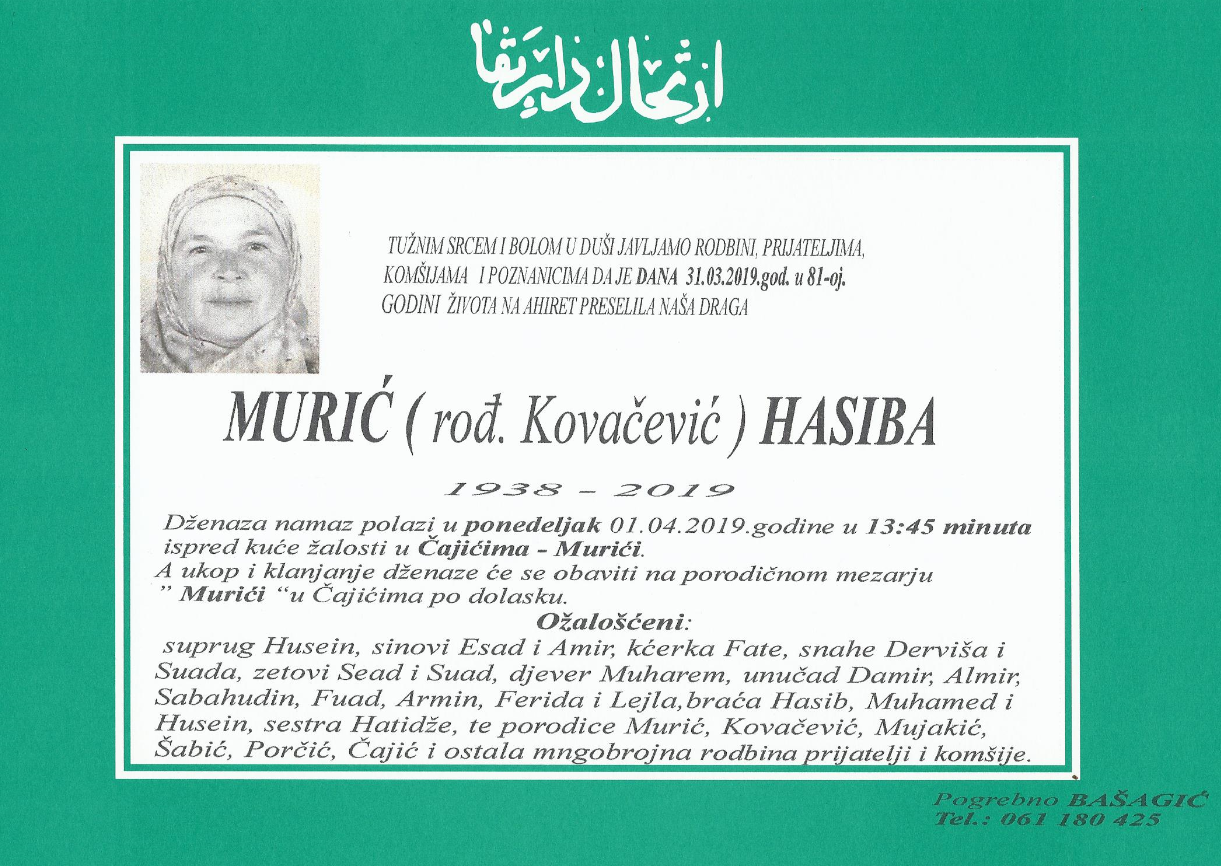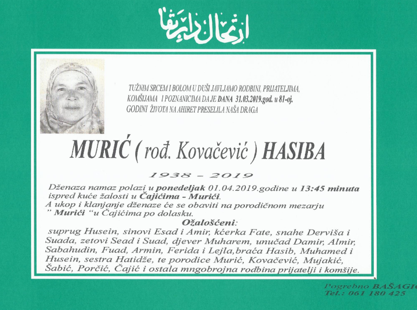 Tužnim srcem i bolom u duši javljamo rodbini, prijateljima, komšijama i poznanicima da je dana 31.03.2019. god. u 81-oj. godini života na Ahiret preselila Murić (rođ. Kovačević) Hasiba.