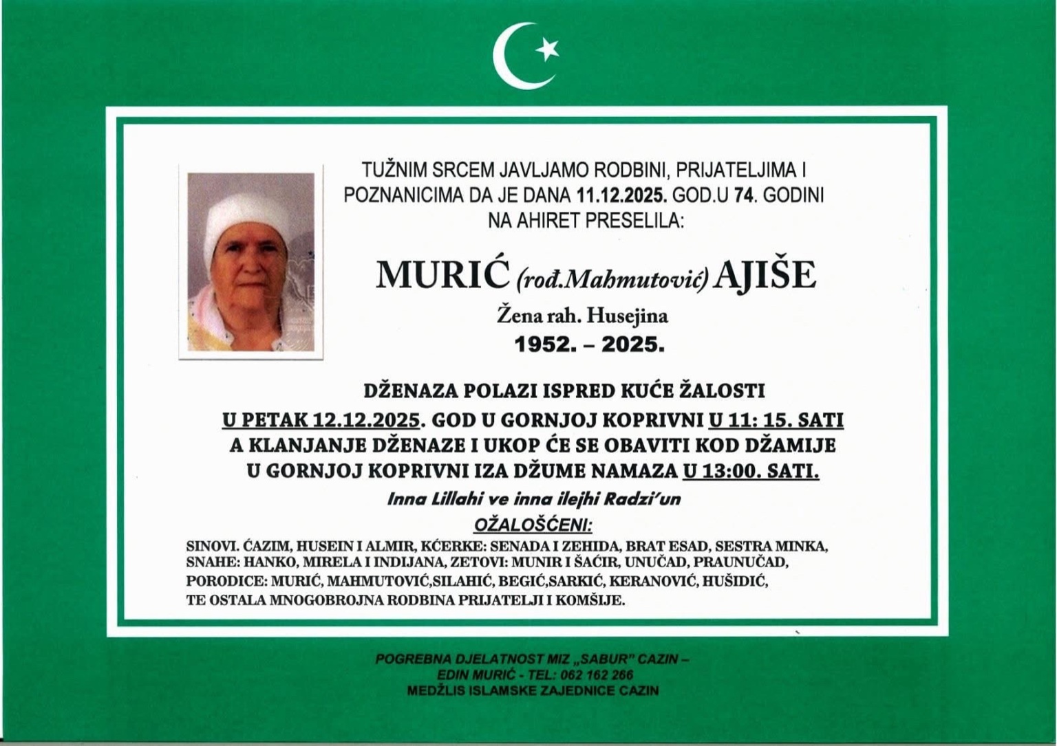 Dženaza polazi ispred kuće žalosti u petak, 12.12.2025. godine, u Gornjoj Koprivni u 11:15 sati, a klanjanje dženaze i ukop će se obaviti kod džamije u Gornjoj Koprivni, iza džuma-namaza u 13:00 sati.