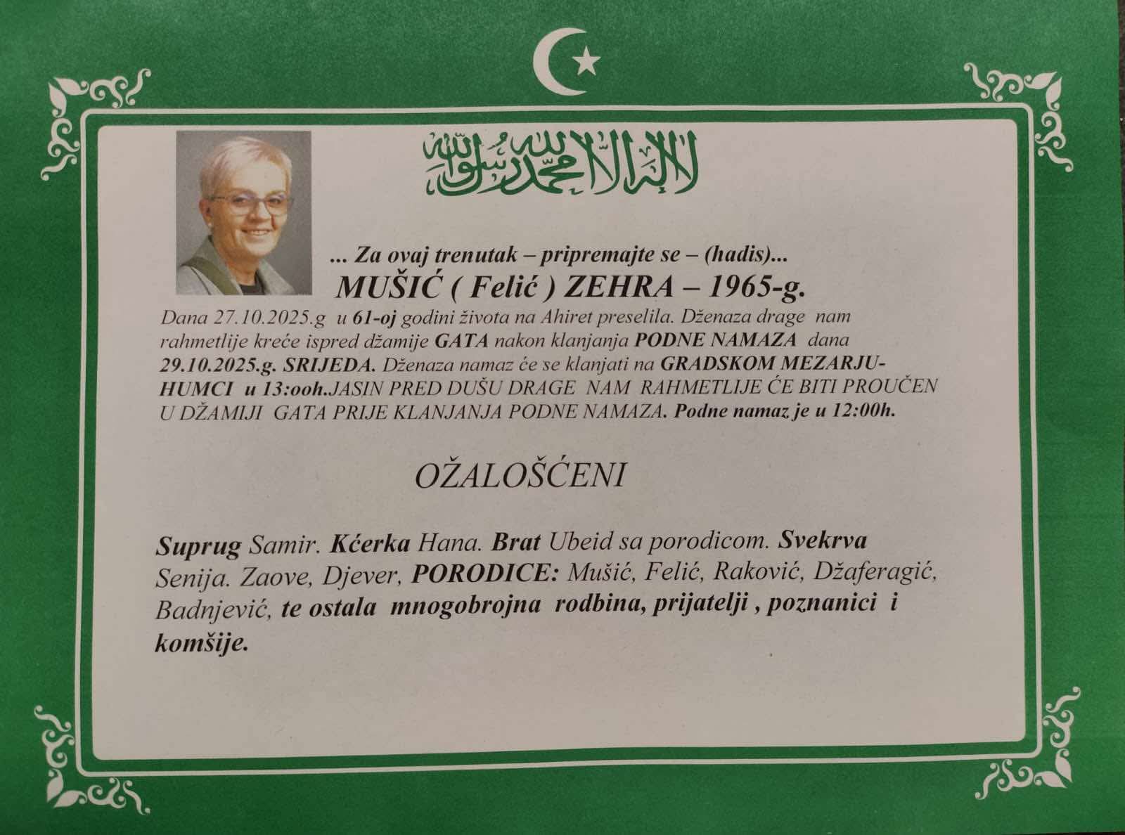 Dženaza drage nam rahmetlije kreće ispred džamije GATA nakon klanjanja PODNE NAMAZA dana 29.10.2025. g. (SRIJEDA).
