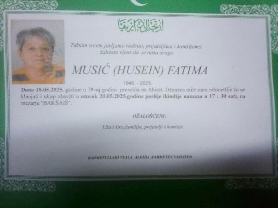 Tužnim srcem jjavljamo rodbini, prijateljima i poznanicima da je dana 18.05.2025. godine u 79-oj godini života, na ahiret preselila naša draga Musić (Husein) Fatima.