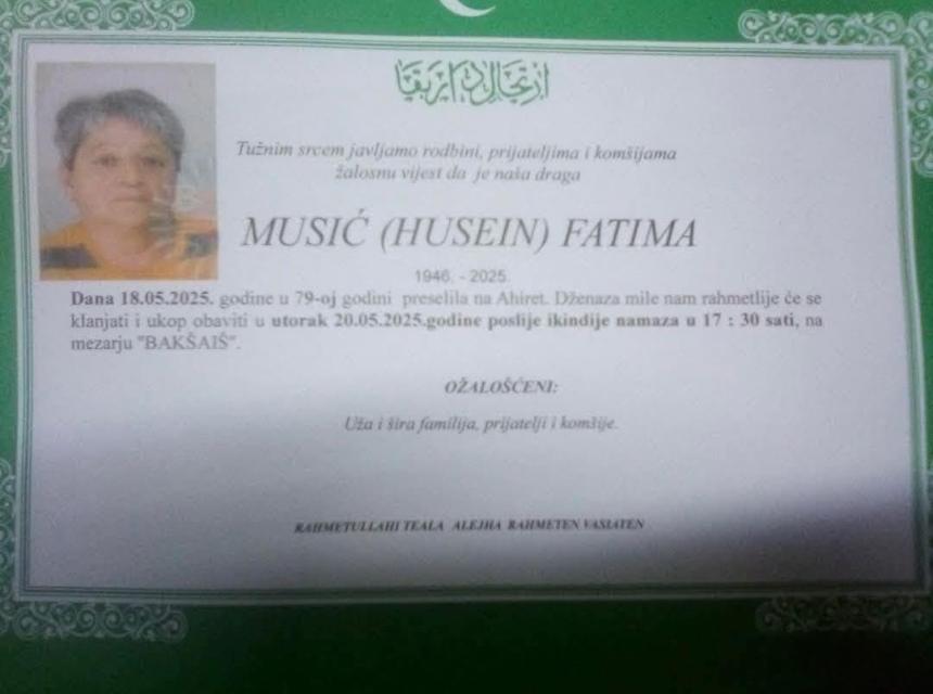 Dženaza će se klanjati i ukop obaviti u utorak 20.05.2025. godine poslije ikindije namaza u 17:30h, na mezarju "BAKŠAIŠ".