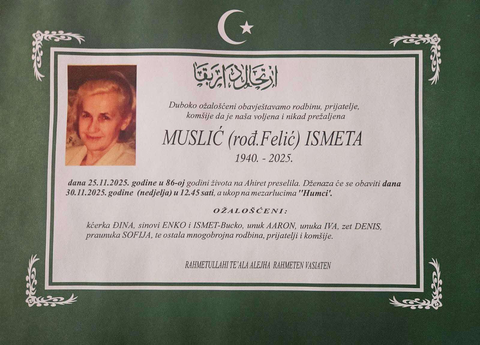 Dženaza će se obaviti dana 30.11.2025. godine (nedjelja) u 12.45 sati, a ukop na mezarlucima “Humci”.