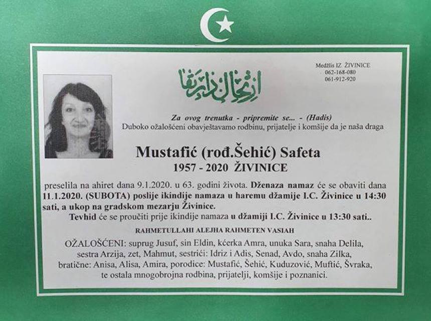 Duboko ožalošćeni obavještavamo rodbinu, prijatelje i komšije da je naša draga Mustafić (rođ.Šehić) Safeta preselila na Ahiret dana 9.1.2020.u 63.godini života.