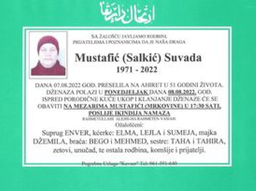 Tužnog srca i s bolom u duši obavještavamo rodbinu, komšije i prijatelje da je naš draga Mustafić (Salkić) Suvada 51-oj godini života preselila na Ahiret.