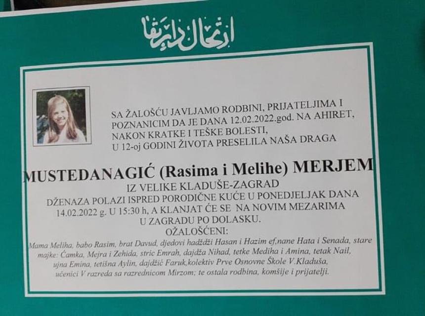 Tužnog srca i s bolom u duši obavještavamo rodbinu, komšije i prijatelje da je naša draga Mustedanagić (Rasima i Melihe) Merjem u 12. godini života dana 12.02.2022. preselila na ahiret.