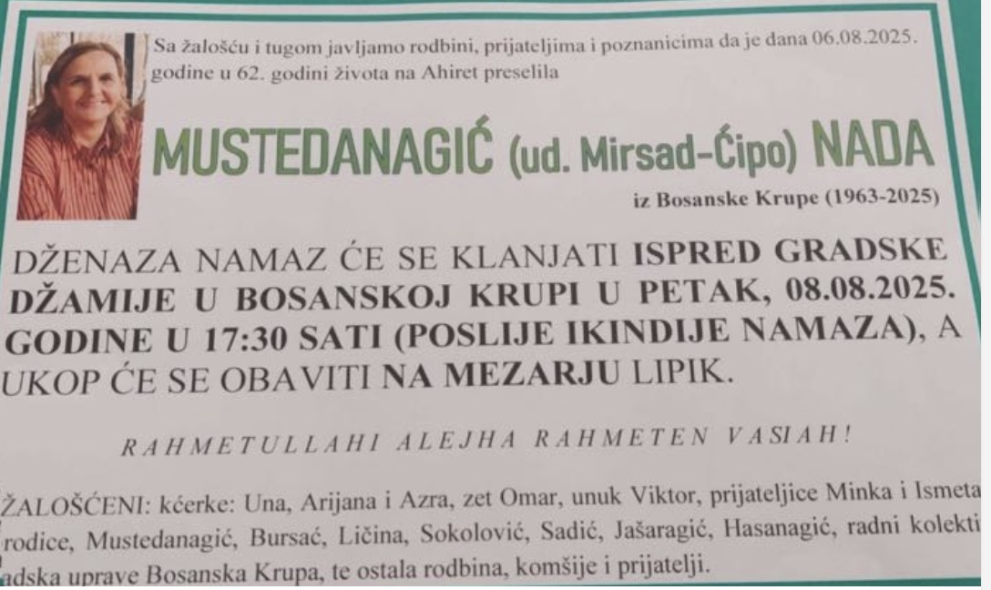 Dženaza namaz će se klanjati ispred Gradske džamije u Bosanskoj Krupi u petak, 08.08.2025. godine u 17:30 sati (poslije ikindije namaza), a ukop će se obaviti na mezarju Lipik.
