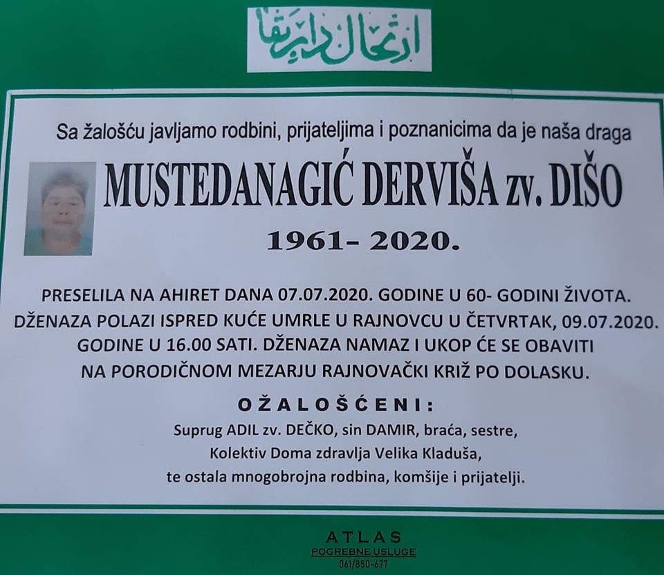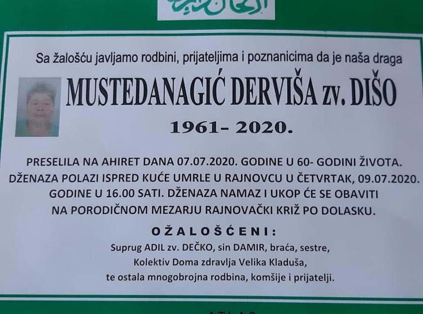 Tužnog srca i s bolom u duši obavještavamo rodbinu, komšije i prijatelje da je naša draga Mustedanagić Derviša zv. Dišo, dana 07.07.2020. godine, u 60. godini života preselila na Ahiret.